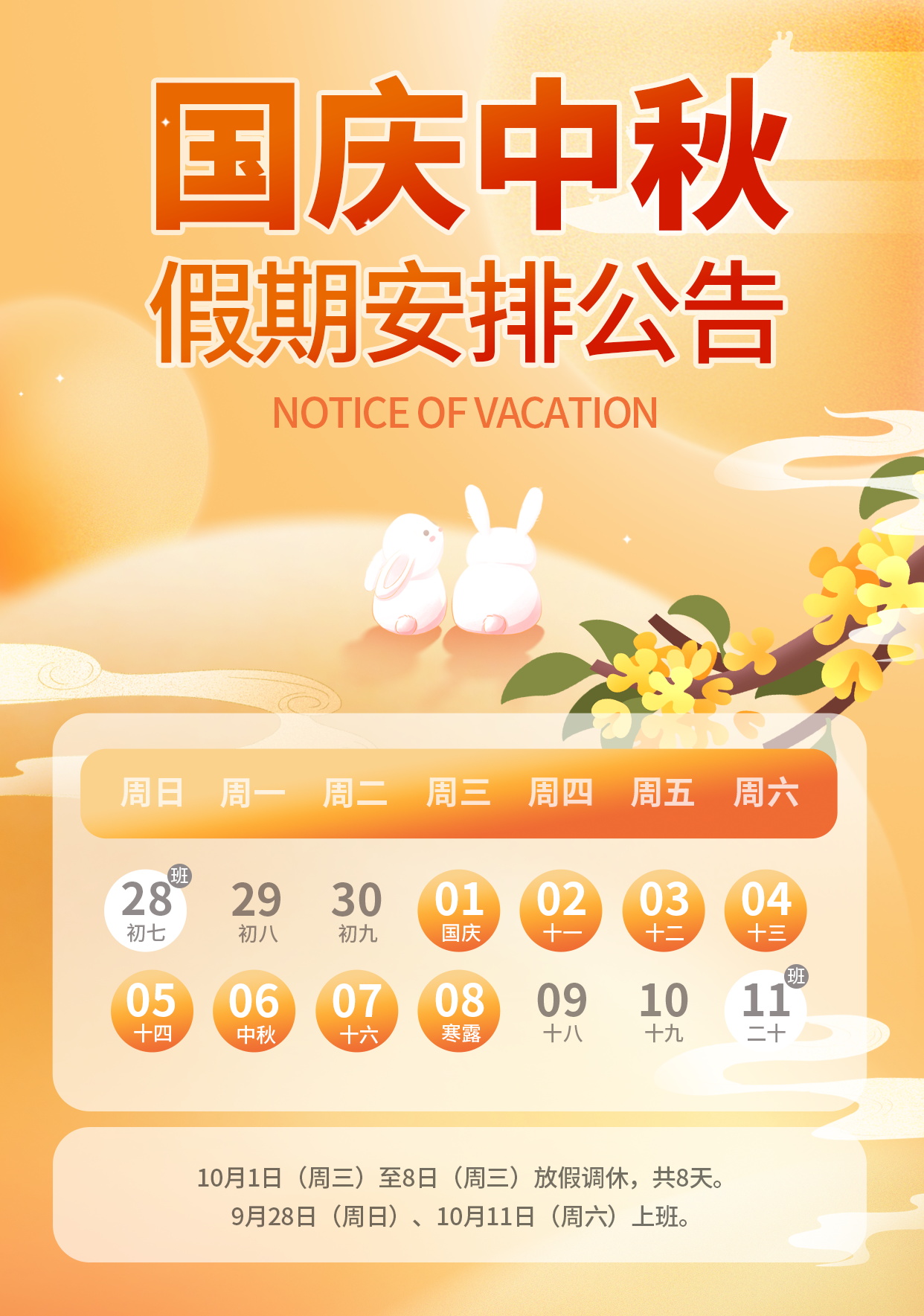 Crisp autumn air carries the scent of sweet osmanthus; as the whole nation celebrates, we are about to welcome this year’s National Day. Thank you for your continued support and attention; our holiday schedule is hereby announced: