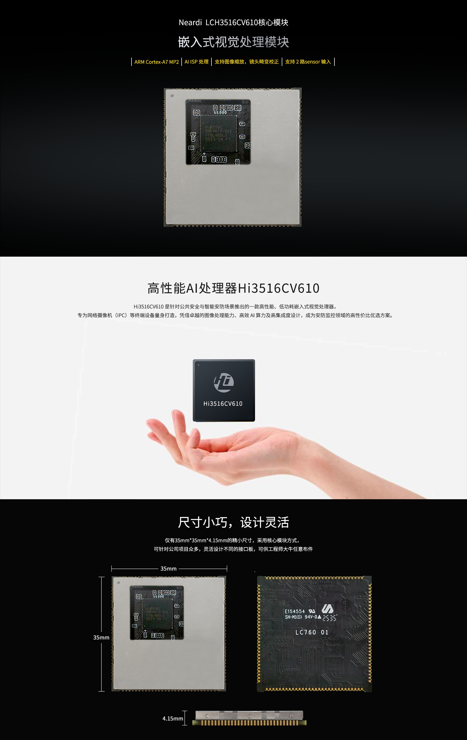 产品介绍:LCH3516CV610核心模块包含CPU,SPI Flash。CPU支持ARM Cortex-A7 MP2,时钟速率950MHz;神经网络处理器NPU支持1TOPS运算性能,内置人脸人形车形检测/包裹检测/宠物检测等算法;支持ISP基础功能,高动态范围,图像增强去噪;视频处理支持图像缩放,镜头畸变矫正,支持H.265,H.264编码最大分辨率为3840*2160,4K20fps,支持MIPI/LVDS/Sub-LVDS/HiSpi多种视频输入接口,最高支持2路Sensor输入。内置1GB DDR3/3L,最高速率2133Mbps,SPI Flash支持1/2/4线模式。